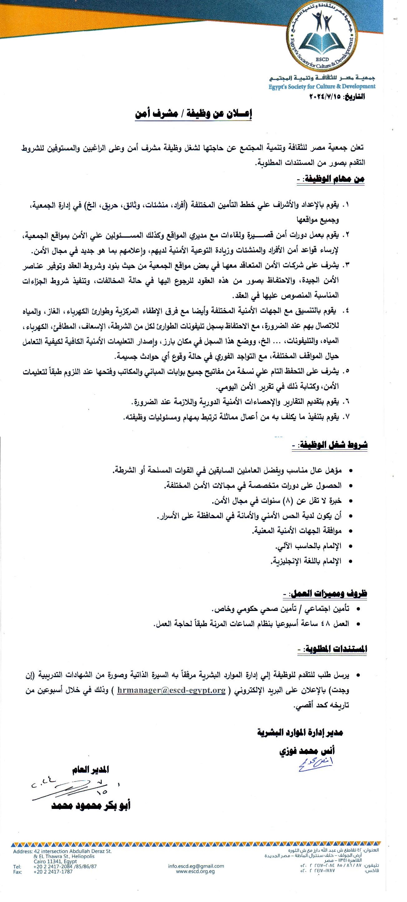 إعلان عن وظيفة مشرف أمن