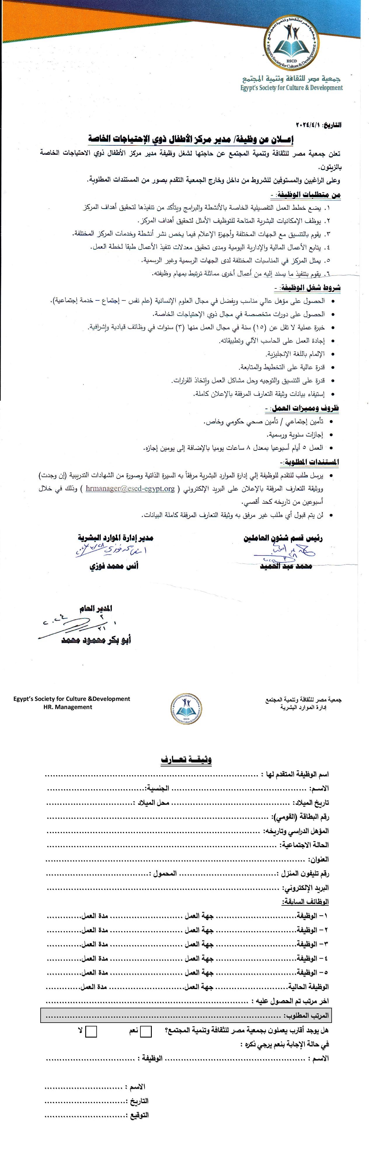 إعلان وظيفة مدير مركز الزيتون